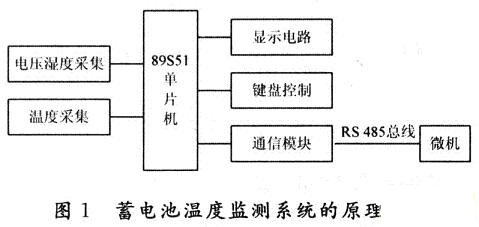 蓄電池溫度監(jiān)測(cè)系統(tǒng)的原理框圖如圖1所示。主要由電壓、溫濕度采集、溫度采集、89S51單片機(jī)、鍵盤控制模塊、顯示電路模塊、通信模塊組成。該系統(tǒng)能完成6組或6組以上通信電池的溫度測(cè)量、1路機(jī)房環(huán)境測(cè)量(溫度、濕度測(cè)量)、2路直流電壓和2路交流電壓測(cè)量,傳輸數(shù)據(jù)距離大于200m。