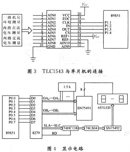 直流電壓、交流電壓以及機(jī)房溫濕度的測(cè)量選用TLC1543,TLC1543為10位11通道的A/D轉(zhuǎn)換器,與單片機(jī)的連接如圖3所示。機(jī)房環(huán)境測(cè)量(溫度、濕度)采用JWS溫濕度變送器,輸出信號(hào)為標(biāo)準(zhǔn)0~5V直流電壓信號(hào);直流電壓的數(shù)據(jù)采集經(jīng)電阻分壓后直接送至A/D轉(zhuǎn)換器,交流電壓的采集經(jīng)分壓整流后也直接送至A/D轉(zhuǎn)換器。