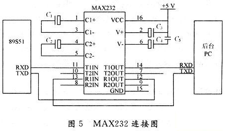 為了滿足數(shù)據(jù)傳輸距離大于200m,通信采用75LBC180全雙工485芯片,單片機(jī)通信電平和計(jì)算機(jī)電平的轉(zhuǎn)換采用MAX232完成,如圖5所示。MAX232芯片是專為電腦的RS232標(biāo)準(zhǔn)串口設(shè)計(jì)的接口電路,使用+5V單電源供電。另外。RS232到RS485的轉(zhuǎn)換可采用專用的轉(zhuǎn)換器,如BOK-60或ATC-160A無(wú)源轉(zhuǎn)換器。