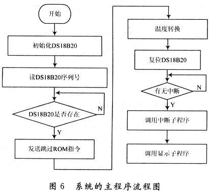 蓄電池溫度監(jiān)測(cè)系統(tǒng)的軟件設(shè)計(jì)主要包括主程序、外部中斷子程序、顯示子程序等。圖6是該系統(tǒng)的主程序流程圖。用于完成對(duì)DS18B20的調(diào)用、中斷管理、測(cè)量溫度值的計(jì)算及溫度值的顯示等功能。主機(jī)89S51首先復(fù)位脈沖使信號(hào)線上所有的DS18B20芯片都被復(fù)位,接著發(fā)送跳過(guò)ROM操作命令,激活在線的所有DS18B20,然后系統(tǒng)轉(zhuǎn)人中斷處理流程,完成溫度轉(zhuǎn)換,讀取等工作。外部中斷子程序完成對(duì)溫度測(cè)量數(shù)據(jù)的讀取,顯示子程序完成液晶顯示器的初始化及顯示溫度值。