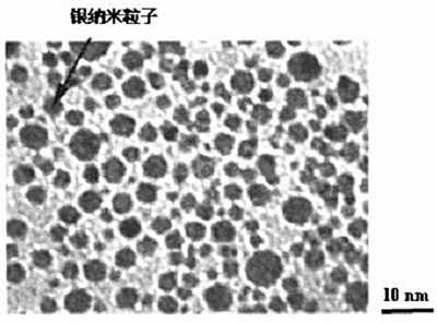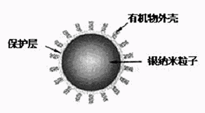 由于納米粒子表面呈活性,為防止其自身凝聚必須要做表面控制。我們所用的納米粒子是平均直徑為10nm左右的銀納米粒子,其表面用有機物保護層進(jìn)行了涂覆。圖3為有機物—銀復(fù)合納米粒子的掃描電鏡圖像,圖4為其結(jié)構(gòu)模式圖。