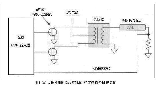 之所以考慮推挽驅(qū)動(dòng)器,因它有很多好處。這種架構(gòu)只用到n溝道MOSFET(見圖6(a)所示),這有利于降低成本和增加逆變器效率。它很容易適應(yīng)較高的逆變器直流電源電壓。采用更高的逆變器直流電源電壓時(shí),只需選擇具有合適的漏-源擊穿電壓的MOSFET即可。不管逆變器的直流電源電壓如何,都可采用同樣的CCFL控制器。但采用n溝道MOSFET的全橋和半橋架構(gòu)就無(wú)法做到這一點(diǎn)。對(duì)于LCD電視非常理想,因?yàn)殡娨曋械哪孀兤髦绷麟娫措妷和ǔ?huì)被穩(wěn)定在±20%。