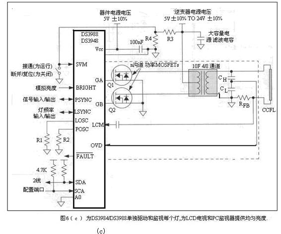 圖6(c)為用DS3984(4通道)和DS3988(8通道)CCFL控制器既解決了本文所提到的所有這些設(shè)計(jì)挑戰(zhàn)。可將這些器件配置為每個(gè)通道驅(qū)動(dòng)一個(gè)燈,或者每通道多個(gè)燈,用戶可靈活裁減設(shè)計(jì),以滿足自己的性價(jià)比目標(biāo)。多個(gè)DS3984/DS3988可輕松級(jí)聯(lián),以支持任意數(shù)量的燈,來(lái)為L(zhǎng)CD電視屏提供背光照明。