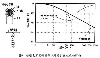 我們平常使用的陶瓷圓片電容器作為旁路電容,可以將高頻干擾短路到地,達到抗干擾的目的。但是電容器的引線電感及電容內部的剩余電感卻限制了它的高頻特性發(fā)揮。圖6是普通電容器做高頻旁路時的引線電感影響例。