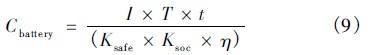 式(8)(9)中I為負載所需電流,T為負載每日工作小時數。Ta為平均日照時間。t為連續雨天數,Ksafe為安全系數,Ksoc為蓄電池容許放電深度,η為變換器效率。按三段式10小時充電法,在恒流充電階段,充電電流icharge為0.1Cbattery。則恒流充電階段,充電功率為: