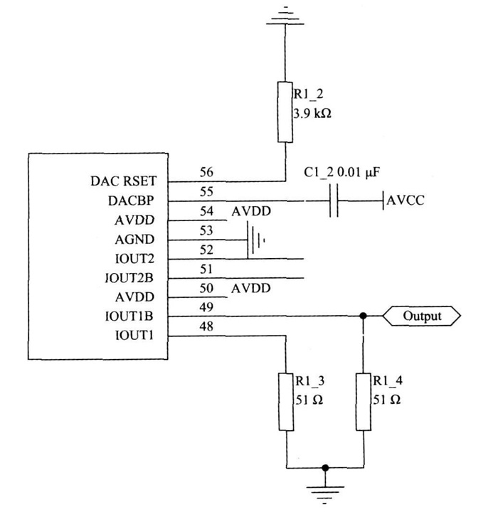 掃頻發生器在本系統中產生寬頻帶掃頻信號以激勵待測電容, 當電容較大時,以常見的電解電容為例,假設電容為1 000 F, 其寄生電感為100 nH, 則按照式(1)可計算出其自諧振頻率為15. 9 kHz, 諧振頻率較低;另以瓷片電容為例, 假設其電容值為10 pF, 寄生電感約為10 nH, 則其自諧振頻率為500 MHz 這兩個信號頻率相差了4 個數量級, 這就需要1 個寬帶的信號發生器, 這也是本部分的設計難點所在。若采用傳統的模擬信號發生的方法, 為了實現信號頻率的可調, 一般會采用變容二極管構成的LC 振蕩器, 然而在信號頻率較低時, 所需要的變容二極管的電容量會很大,而傳統的變容二極管電容值一般只是幾個pF 至幾百pF ,很難滿足低頻振蕩要求。為了簡化掃頻電路, 以及實現數字化控制, 這里采用DDS 技術產生寬帶信號。DDS 采用的是DA 轉換器的原理, 通過計數器累加實現的連續波形輸出 , 而DDS 芯片外圍電路簡單, 通過寫它的寄存器便可實現信號頻率的調節, 同時產生的信號頻率分辨率高,一般可以達到0. 01 Hz 級別, 信號頻率的跨度大, 可以實現從幾Hz 到幾百MHz 的連續信號, 非常適合做掃頻發生器。這里采用了AD9854 這款DDS 芯片, 它在300 MHz 時鐘驅動下, 按照乃奎斯特采樣定律可以產生最高150 MHz 的信號,為了得到信號較好的頻率則一般只得到最高100 MHz 的信號。若要得到高于100 MHz 的信號, 則可采用其高次諧波得到。基于AD9854 的信號發生電路如圖4 所示。限于篇幅,僅畫出了關鍵的輸出部分和電流設置部分。AD9854 內置4~ 12 倍頻的時鐘倍頻器, 因此可以外加1 個較低頻率的時鐘,通過倍頻器倍頻至300 MHz, 這樣可以極大的降低高速片外時鐘對系統造成的電磁兼容性問題。AD9854 內部有1個頻率控制字寄存器,通過寫該寄存器的值便可以改變輸出信號的頻率, 非常適合數字控制。同時由于時鐘采用的時晶體振蕩器,因此輸出頻率的穩定度和分辨率都非常高, 一般為10- 6數量級。