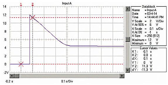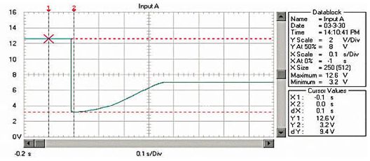 由于RM、RB、RL均非常低,啟動電流非 常大。例如用12V、45Ah的蓄電池啟動安裝1.9升柴油機(jī)的汽車,蓄電池的電壓在啟動瞬間由12.6V降到約3.6V!啟動過程的蓄電池電壓波形如圖 1;啟動瞬時的電流達(dá)550A,約為蓄電池的12C的放電率!啟動過程的蓄電池電流波形如圖2,(電流傳感器的電流/電壓變換比率:100A/V)。盡管 車用蓄電池是啟動專用蓄電池,可以高倍率放電,但在圖1中可以看出,10倍以上的高倍率放電時的蓄電池性能變得很差,而且,如此高倍率放電對蓄電池的損傷 也是非常明顯的。啟動過程的電壓劇烈變化也是極強(qiáng)的電磁干擾,可以造成電氣設(shè)備的“掉電”,迫使電氣設(shè)備在發(fā)電機(jī)啟動過程結(jié)束后重新上電,計算機(jī)在這個過程中非常容易死機(jī)。因此,無論從改善汽車電氣設(shè)備的電磁環(huán)境還是改善汽車的啟動性能和蓄電池的性能、延長使用壽命來考慮,改善汽車電源在啟動過程的性能是必要的。