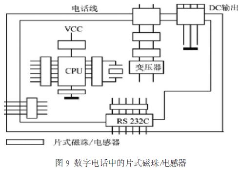 圖8、圖9、圖10 分別示出了磁珠在直流供電回路、數字電話、抑制 EMI 噪聲濾波器中的應用實例。