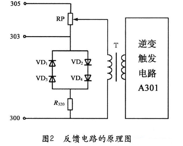 圖2為反饋電路的原理圖,T是隔離變壓器,RP是逆變角調(diào)整電位器,VDl~VD4是反并聯(lián)二極管。