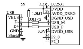 CC2531的USB硬件連接很簡單,如圖3所示。采用USB總線供電方式,通過電壓轉換芯片AM11173.3為硬件電路提供3.3 V電壓(圖中未畫出)。由于該設備為全速設備,因此D+信號線通過電阻上拉。