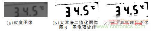 由上圖2所示,得到的圖像是彩色圖像,由于光照強度等原因,液晶屏圖像中常有許多噪聲點。為了得到精確圖像,本文對圖像進行灰度化處理、大津法二值化處理和開運算處理。下圖3中(a)、(b)和(c)分別為灰度化處理、大津法二值化處理和開運算處理后的結果。