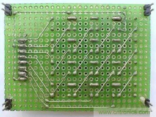 對于元器件在萬能板上的布局,大多數(shù)人習(xí)慣“順藤摸瓜”,就是以芯片等關(guān)鍵器件為中心,其他元器件見縫插針的方法。這種方法是邊焊接邊規(guī)劃,無序中體現(xiàn)著有序,效率較高。但由于初學(xué)者缺乏經(jīng)驗,搭出來的板是這樣的……