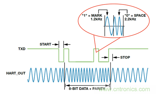 圖 2 顯示了調(diào)制涉及的主要模塊:FSK直接數(shù)字合成 (DDS)引擎、DAC(開關(guān)電阻串類型)和緩沖區(qū)。要發(fā)送的數(shù)字?jǐn)?shù)據(jù)通過UART輸入。調(diào)制器通過將RTS(請(qǐng)求發(fā)送)信號(hào)拉低來使能。調(diào)制器將TXD輸入端的UART編碼HART數(shù)據(jù)位流轉(zhuǎn)換成一系列二進(jìn)制 1200 Hz(“1”)和 2200 Hz(“0”)信號(hào)音(見圖 3)。DDS在任何一種頻率下生成正弦數(shù)字字流,DAC將其轉(zhuǎn)換為大約 493 mV的p-p模擬正弦波。此正弦波信號(hào)在內(nèi)部進(jìn)行緩沖并在HART_OUT引腳上輸出。該DDS引擎本身會(huì)產(chǎn)生連續(xù)相位信號(hào),因此在頻率之間切換時(shí)避免了出現(xiàn)任何輸出不連續(xù)。在HART_OUT上進(jìn)行內(nèi)部緩沖的主要優(yōu)勢(shì)是產(chǎn)生很高的驅(qū)動(dòng)能力,無需外部模擬緩沖,也不會(huì)出現(xiàn)它們帶來的問題。HART_OUT引腳直流偏置至 0.75 V,并應(yīng)容性耦合至負(fù)載。有關(guān)更多詳細(xì)信息,請(qǐng)參見AD5700/AD5700-1 數(shù)據(jù)手冊(cè)。