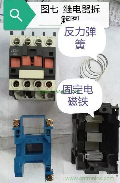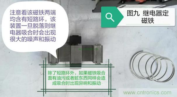 接下來我們再來看一下繼電器內部吸合部分的構造,在這部分當中以固定吸合磁鐵上短路環所引發的故障最為常見,詳情請看圖七至圖九的展示: