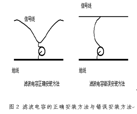 電容的諧振頻率由ESL和C共同決定,電容值或電感值越大,則諧振頻率越低,也就是電容的高頻濾波效果越差。ESL除了與電容器的種類有關外,電容的引線長度是一個十分重要的參數,引線越長,則電感越大,電容的諧振頻率越低。因此在實際工程中,要使電容器的引線盡量短,電容器的正確安裝方法和不正確安裝方法如圖2所示。