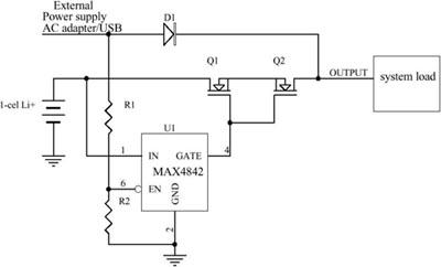 另外,MAX4842的過壓保護門限為4.4V-5.0V,也高于單節鋰電的4.2V上限電壓。電源切換電路是利用MAX4842的使能控制引腳/EN配合分壓電阻R1/R2實現的。當沒有外部電源接入時,如果電池電壓高于2.8V-3.2V的保護門限,/EN被R2拉低,MAX4842驅動Q1、Q2的柵極為高電平使其導通,電池為負載供電;當有外部電源接入時,通過R1/R2分壓后在/EN引腳上產生的電壓高于1.47V后MAX4842被禁止,Q1、Q2被關閉,由外部電源給負載供電。圖中的二極管D2用于阻斷灌入外部電源的反向電流,并防止/EN被錯誤拉高。由于它串在外部供電通路上,損失一點效率沒有關系。