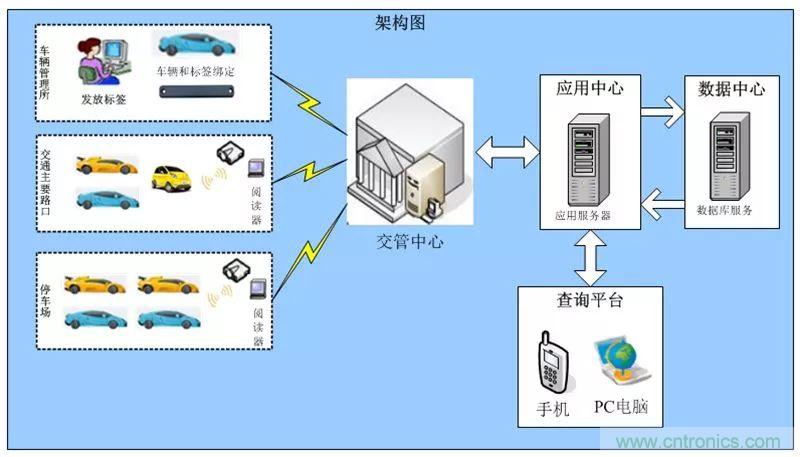 正是由于電子車牌相比傳統(tǒng)車牌有這么多的優(yōu)勢和特點,可以預見在不久的將來,機動車輛將會逐步使用帶有電子標簽的電子車牌替代目前的傳統(tǒng)車牌,這樣一來,從車輛前端的電子車牌,到后端的車牌識別、數(shù)據傳輸、車輛管理、數(shù)據存儲、終端查詢等整個平臺的構建和發(fā)展前景都是十分廣闊的,圖2是整個平臺組成架構的示意圖。