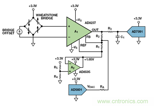 這個(gè)問題可通過圖 5 所示的電路來解決。電橋放大器A1是一個(gè)像AD8237 一樣的ICF儀表放大器。放大器A2,帶R4 和R5,將A1的零電平輸出設(shè)為中間電源。AD5601 8 位DAC對(duì)輸出進(jìn)行調(diào)整,通過RA使電橋失調(diào)為 0。然后,放大器的輸出由AD7091微功耗 12 位ADC數(shù)字化。