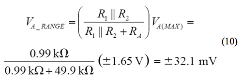 由于 DAC 可以擺動(dòng)±1.65 V,因此,總失調(diào)調(diào)整范圍可通過由 RA以及 R1和 R2的并聯(lián)組合形成的分壓器給定,其計(jì)算方法如下: