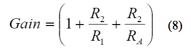 其中,VIN(MAX)為傳感器預(yù)期的最大失調(diào)。等式(5)同時(shí)顯示,調(diào)整電路的插入會(huì)修改從輸入到輸出的增益。即使如此,其影響一般也很小,增益可以重新計(jì)算為: