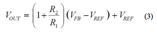 由于輸入之間的電壓等于反饋(FB)與參考(REF)端子之間的電壓時(shí),放大器的反饋要求可得到滿足,因此,我們可將該公式重寫為