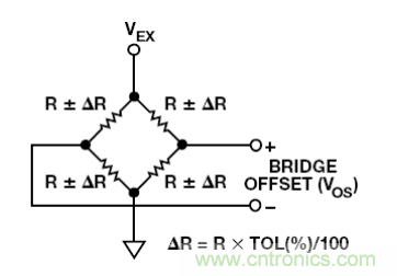 惠斯登電橋是這種情況的經(jīng)典例子,但像生物傳感器一類的原電池具有類似的特性。電橋輸出信號(hào)為差分信號(hào),因此,儀表放大器是高精度測(cè)量的首選。理想情況下,無負(fù)載電橋輸出為零,但僅當(dāng)所有四個(gè)電阻均完全相同時(shí),這種情況方為真。假如有一個(gè)以分立式電阻構(gòu)建的電橋,如圖 1 所示。最差情況差分失調(diào) VOS 為: