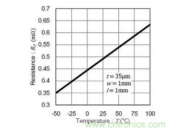 此外,如果知道每單位面積銅的電阻值Rp在不同溫度下的變化(如下圖資料所示),可以使用以下公式估算整個銅的電阻值R。注意下圖銅的尺寸是:厚度(t)35μm,寬度(w)1mm,長度(?)1mm。