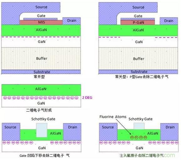 2、GaN和AlGaN異質結內在的產生導電的二維電子氣,常開型GaN器件通常稱為耗盡型GaN功率晶體管,必須在Gate加上反壓,才能將Gate下面AlGaN層中的二維電子氣去除,從而將器件關斷。這種常開型器件在應用中會產生許多問題,因此不太適合實際的應用。
