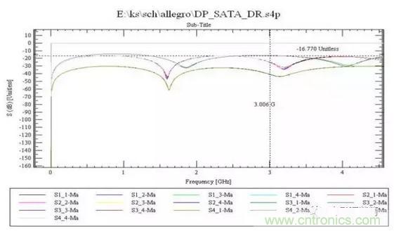 以上的相關(guān)步驟設(shè)置好以后就可以進(jìn)行仿真了,allegro可以進(jìn)行信號(hào)的反射仿真、串?dāng)_仿真,差分線還要進(jìn)行眼圖分析。當(dāng)然仿真也分前仿真和后仿真,在利用allegro進(jìn)行PCB設(shè)計(jì)的時(shí)候還需要結(jié)合仿真的結(jié)果實(shí)時(shí)的對(duì)設(shè)計(jì)進(jìn)行修改以達(dá)到符合要求的目的。由于仿真過程復(fù)雜,步驟繁瑣,在此不一一進(jìn)行描述, 差分對(duì)的布線有兩點(diǎn)要注意,一是兩條線的長度要盡量一樣長,等長是為了保證兩個(gè)差分信號(hào)時(shí)刻保持相反極性,減少共模分量。另一是兩線的間距(此間距由差分阻抗決定)要一直保持不變,也就是要保持平行。平行的方式有兩種,一為兩條線走在同一走線層(side-by-side),一為兩條線走在上下相鄰兩層(over-under)。一般以前者side-by-side 實(shí)現(xiàn)的方式較多。等距則主要是為了保證兩者差分阻抗一致,減少反射。對(duì)差分對(duì)的布線方式應(yīng)該要適當(dāng)?shù)目拷移叫小K^適當(dāng)?shù)目拷且驗(yàn)檫@間距會(huì)影響到差分阻抗(differential impedance)的值, 此值是設(shè)計(jì)差分對(duì)的重要參數(shù)。需要平行也是因?yàn)橐3植罘肿杩沟囊恢滦浴H魞删€忽遠(yuǎn)忽近, 差分阻抗就會(huì)不一致, 就會(huì)影響信號(hào)完整性(signal integrity)及時(shí)間延遲(timing delay)。從仿真的S參數(shù)曲線圖可以分析差分對(duì)的差分阻抗(differential impedance),以及信號(hào)完整性。下面給出本設(shè)計(jì)中的關(guān)鍵信號(hào)仿真波形以供加以說明。 從仿真圖例圖5看到,S11在0-3.0GHz 的頻域范圍內(nèi)其最劣化的指標(biāo)為:-16.770db以下 ,S22(粉紅色的曲線)也不劣于-17db。 這說明該差分對(duì)的差分阻抗(differential impedance)接近設(shè)計(jì)指標(biāo),信號(hào)完整性得到了保證。