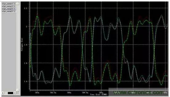 通過差分對(duì)IN,OUT的HSPICE仿真,圖6顯示的結(jié)果:差分對(duì)線的對(duì)稱良好。