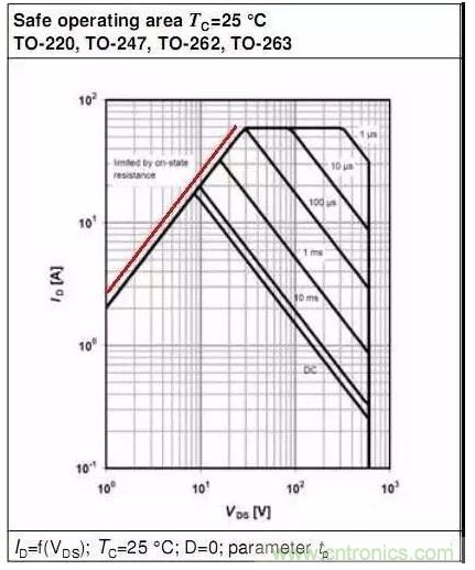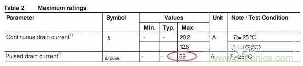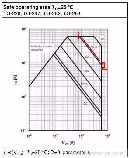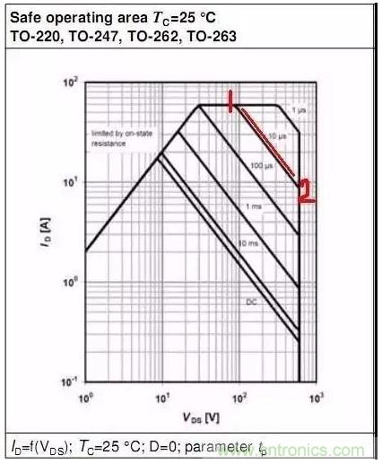 此部分為MOSFET的最大脈沖電流限制,此最大電流對(duì)應(yīng)ID_pulse.