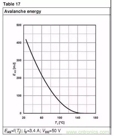 計(jì)算出來EAS后,對(duì)比datasheet上的EAS值,若在datasheet的范圍內(nèi),則可認(rèn)為是安全的(當(dāng)然前提是雪崩電流<IAR)同時(shí),還得注意,EAS隨結(jié)溫的增加是減小的,如下圖:
