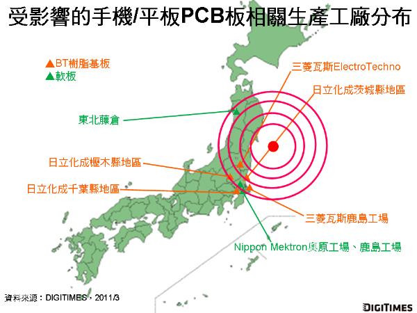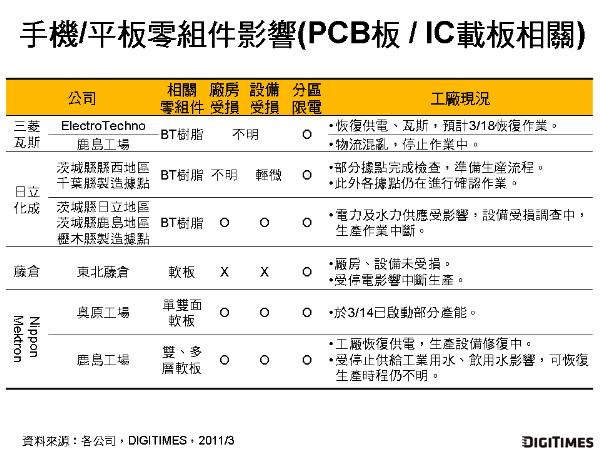 在手機/平板用PCB、IC載板材料BT樹脂等相關(guān)零組件方面,包含三菱瓦斯化學(xué)、日立化成、藤倉、Nippon Mektron等日廠旗下工廠受地震影響作業(yè)中斷,停止生產(chǎn)。