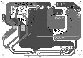 對(duì)于元器件的放置,由于開關(guān)電源的輻射干擾(E)與電流通路中電流(I)的大小,通路的環(huán)路面積(A),以及電流頻率(f)的平方等三者的乘積成正比,即E=I·A·f2。運(yùn)用這一關(guān)系的前提是通路尺寸遠(yuǎn)小于頻率的波長(zhǎng)(此電路符合條件)。