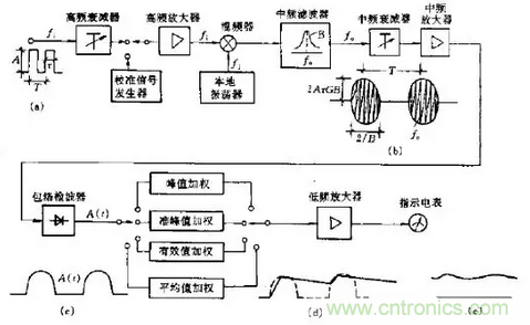 其電路結(jié)構(gòu)類似于半導體收音機。測量時先將測量儀調(diào)諧,對準某個頻率fi。該頻率經(jīng)高頻衰減器和高頻放大器后進人混頻器,與本地振蕩器的頻率fl混頻,產(chǎn)生很多混頻信號。經(jīng)過中頻濾波器以后僅得到中頻f0=fl-fi。中頻信號經(jīng)中頻衰減器、中頻放大器后,由包絡(luò)檢波器進行包絡(luò)檢波,濾去中頻得到其低頻包絡(luò)信號A(t)。A(t)再進一步進行加權(quán)檢波,加權(quán)可根據(jù)需要獲得A(t)的峰值(Peak)、有效值(rms)、平均值(Ave)或準峰值(QP),這些值經(jīng)低頻放大后可推動電表指示。測量前如果用校準信號發(fā)生器的信號進行預(yù)先校準, 則可以直接讀數(shù)。騷擾信號的讀數(shù)等效于正弦信號的有效植。