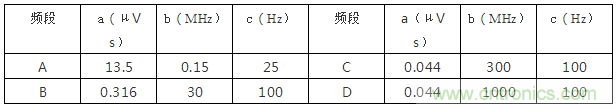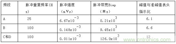 表3的含義是:在A、B、C、D各頻段內(nèi),分別輸入各自的標準周期脈沖,要求脈沖的幅度×寬度等于a(μVs),重復(fù)頻率為c(Hz),該周期脈沖的頻譜至少應(yīng)該在b(MHz)以下是均勻的,脈沖信號發(fā)生器的源阻抗應(yīng)和騷擾測量儀輸入阻抗相等。對于該輸人信號,騷擾測量儀在該頻段的任何頻率上的讀數(shù)都應(yīng)該等于60dB(μV)。