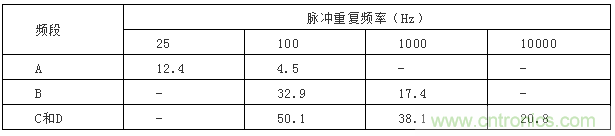 所謂相對脈沖特性指輸人周期性脈沖信號時,脈沖的重復(fù)頻率越高,其讀數(shù)越高,重復(fù)頻率低,讀數(shù)低。當讀數(shù)不變時輸人脈沖的幅度和重復(fù)頻率的關(guān)系應(yīng)符合表4的規(guī)定。