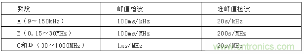 在準峰值測量時,如想要在某個頻率點得到較穩(wěn)定的測量值,則測量時間應(yīng)大于檢波器充放電時間和電表機械時間常數(shù)之和,并且測量不止一個周期,所以一般準峰值測量時間要求比較長。如果測量儀具有掃頻測量功能,則設(shè)置的掃描時間應(yīng)符合表9的規(guī)定。在實際測量中,往往先用峰值進行全頻段測量,然后再對超過限值的頻率點進行峰值測量,這樣可以大大節(jié)省測量時間。
