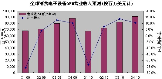 下圖所示為iSuppli公司對于各季度全球消費電子設備營業收入的預測。