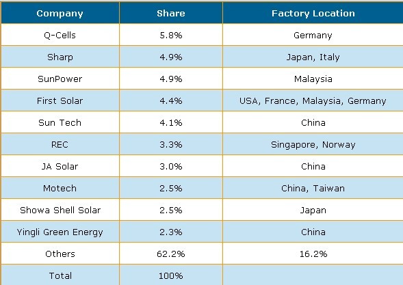六 :依照2009年全球太陽能電池(Cell)的產(chǎn)能來看,F(xiàn)irst Solar 是最大廠商,其產(chǎn)能達(dá)到10億瓦(1 GW),Q-Cells 與 Suntech 并列第二。在接下來的數(shù)年之內(nèi),主要的設(shè)備投資亦由這些領(lǐng)導(dǎo)廠商所帶動。DisplaySearch預(yù)測到2013年,F(xiàn)irst Solar, Q-Cells, Suntech 等前三大廠商以及JA Solar, Motech, REC, SunPower, Yingli, Showa Shell Solar, and Sharp 等等會是全球前十大供貨商,合計產(chǎn)能將達(dá)16GW (160億瓦),將占2013年全球產(chǎn)能的38%。