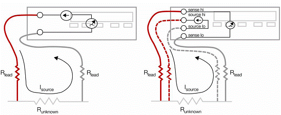 源端引線中的串聯(lián)電阻不影響電流流動。測量/傳感引線幾乎沒有電流流動,因為儀表的輸入阻抗很高。這意味著測量引線中沒有IxR電壓下跌。因此,您只需測量由于流經(jīng)的源電流而在未知電阻器中產(chǎn)生的電壓下跌。