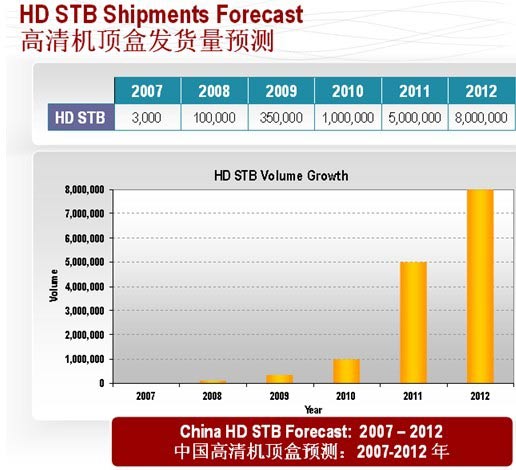 此外,博通特別對高清機頂盒市場做了分析。寬帶通訊事業(yè)部資深市場總監(jiān)JohnGleiter說,由于政府大力推進高清內(nèi)容進入消費者市場,預(yù)示著中國的高清機頂盒產(chǎn)業(yè)正式破冰啟航。與此同時,廣電總局要求的九套免費高標清同播的衛(wèi)視節(jié)目將從現(xiàn)在開始不斷完善。在總局內(nèi)容高清化的時間表中,到2010年,這五套衛(wèi)視的所有節(jié)目都需實現(xiàn)高、標清同播,這就打開了之前制約高清電視發(fā)展的內(nèi)容瓶頸。而高清平板電視機的普及更為高清大發(fā)展迎來了契機。目前70%的平板電視機是高清或全高清兼容的,這就意味著購買高清電視機的消費者將成為運營商挖掘的潛在用戶。單一的數(shù)字化整轉(zhuǎn)運營商需要大量的成本投入,現(xiàn)在很多運營商將未來的盈利模式都鎖定在高清和互動兩個方面,所以未來可能有更多的運營商考慮“高清轉(zhuǎn)換”,這就帶來了有線高清機頂盒將在2010年大幅增長的趨勢。In-Stat預(yù)測,到2010年末將交付50萬臺先進的有線電視機頂盒,這些機頂盒都將具有高清處理能力。