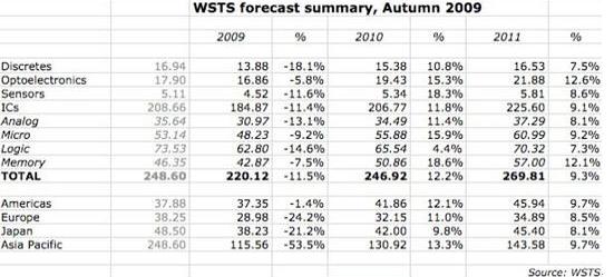 WSTS預測2010年全球半導體業將增長12%,達到2470億美元,此數據比7月的預測又增加了18%。其中最快的亞太地區將從2009年的下降53%,躍升到增長13.5%。