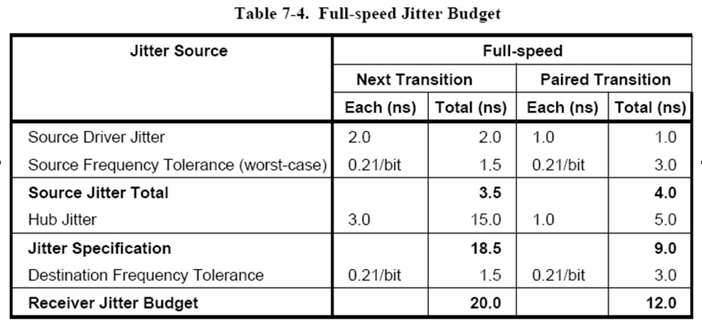 USB2.0是一種復雜的總線結構,既包括高速、全速、低速三種速率級別,也包括主機、設備、集線器三類產品,每種類別又包括多個參數需要測試,幅度、抖動、時序、過程等特性都需要一一分析是否滿足規范要求。USB2.0一致性測試規范對HighSpeed的Device分析就定義了幾十個參數。每一種參數的測量對于示波器的使用都定義了設置參數,如下1就是USB-IF對全速抖動測試的容限范圍規定: