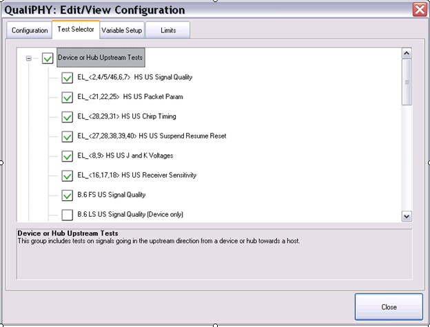 QualiPHY軟件支持用戶可定制化測試項目,可以選擇單個或多個項目分別測試,從而大大提高了靈活性。圖2描述的是USB2.0 High Speed的Device or Hub測試項目定制窗口。
