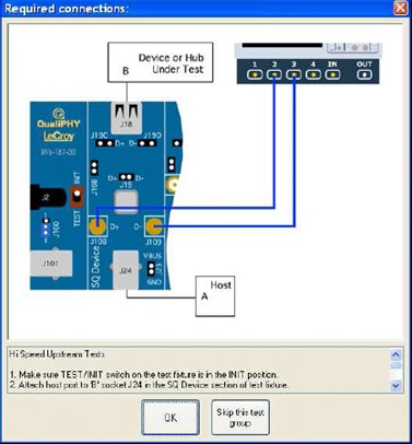 QualiPHY軟件的用戶界面設計非常人性化和直觀實用,它會以圖表化的方式顯示出一致性測試的每個環節中測試夾具、示波器主機和DUT三者之間的拓撲關系,使用者無需記憶,就能正確設置測試環境。下圖4清晰 顯示了USB2.0高速設備信號質量測試中的夾具、DUT和示波器連接關系。