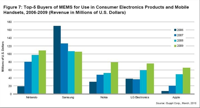 據(jù)iSuppli公司,日本任天堂在2009年超越韓國的三星,成為用于消費電子產品和手機的微機電系統(tǒng)(MEMS)的全球最大買家。