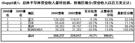 表1所示為iSuppli公司對(duì)2009年各地區(qū)半導(dǎo)體營業(yè)收入的最終估計(jì)。