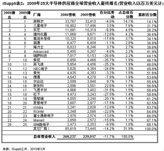 表2所示為iSuppli公司對(duì)2009年全球半導(dǎo)體廠商營業(yè)收入的最終排名。