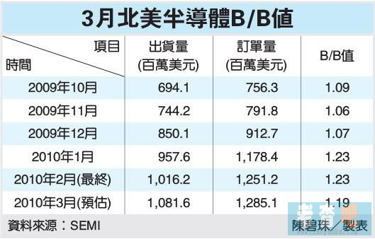 國際半導體設備材料產業協會(SEMI)公布,3月最新北美半導體訂單出貨比(Book-to-Bill)為1.19,較2月修正后的1.23略為下降,仍是連續第九個月超過1以上的紀錄,加上絕對訂單,與出貨金額各創30個月與20個月新高,顯示半導體景氣仍在多頭。